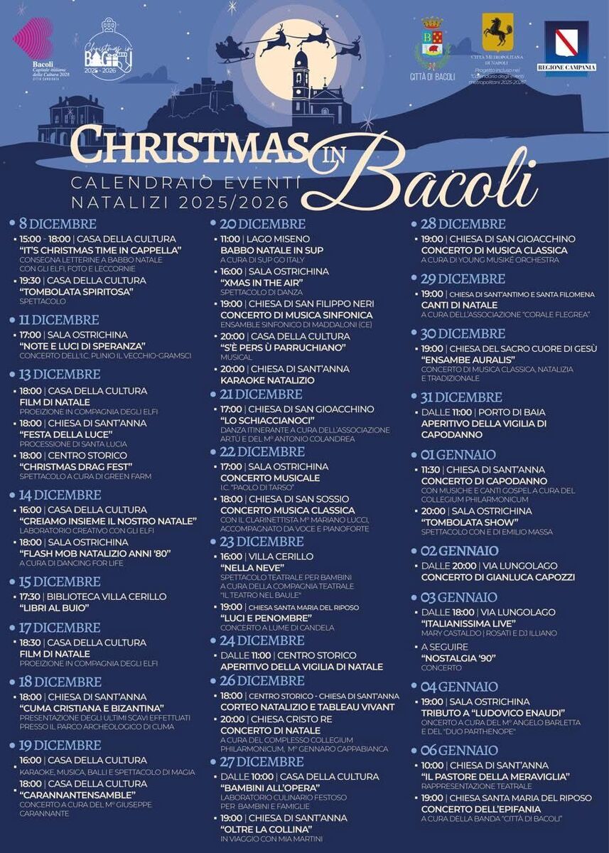 A Bacoli il programma natalizio si sviluppa dall’8 dicembre fino all’Epifania, coinvolgendo l’intero tessuto cittadino. La Casa della Cultura e la Sala Ostrichina ospitano appuntamenti tra spettacoli, proiezioni e iniziative per famiglie. Il calendario alterna momenti di forte spiritualità, con concerti nelle chiese di Sant’Anna, San Gioacchino, San Filippo Neri e Santa Maria del Riposo, a eventi più popolari come serate di intrattenimento e appuntamenti legati alle tradizioni.