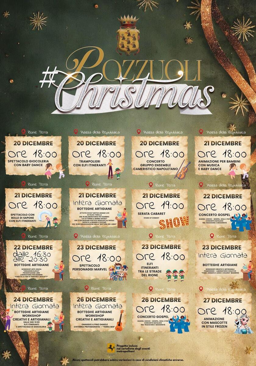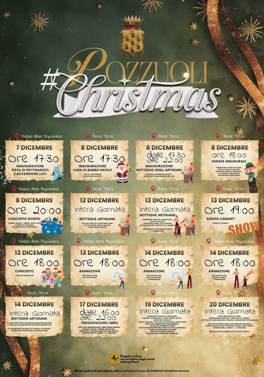 Pozzuoli affianca Bacoli con un cartellone vivace e orientato alla dimensione familiare. Dal 7 dicembre fino a fine mese, il cuore degli eventi batte tra Rione Terra e Piazza della Repubblica, trasformati in veri villaggi natalizi.