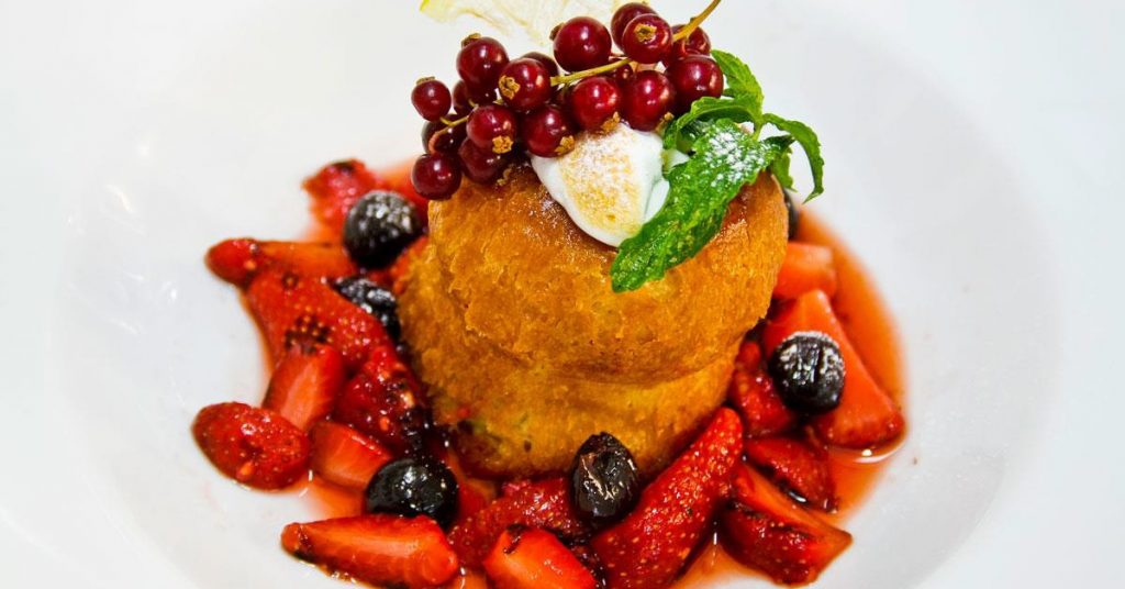 - Dessert: Babà napoletano inzuppato al limoncello con frutti rossi saltati